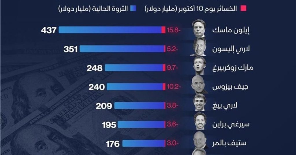 وبحسب بيانات مؤشر بلومبرغ للمليارديرات، تكبد إيلون ماسك أكبر خسارة بلغت 15.8 مليار دولار، تلاه جيف بيزوس بـ10.2 مليار دولار، ثم مارك زوكربيرغ بـ9.7 مليار، ومايكل ديل بـ5.9 مليار دولار، ولاري إليسون بـ5.2 مليار.