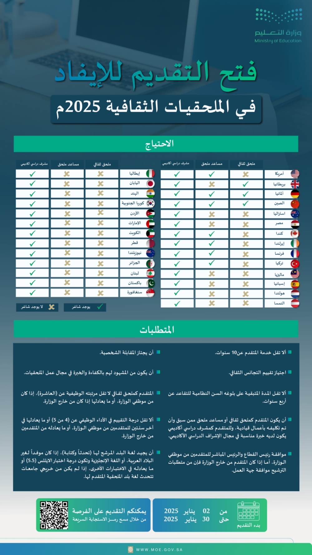 ويأتي هذا الإعلان لتلبية احتياجات الملحقات الثقافية في 27 دولة حول العالم ضمن وظائف تشمل مشرف دراسي أكاديمي ومساعد ملحق وملحق ثقافي.