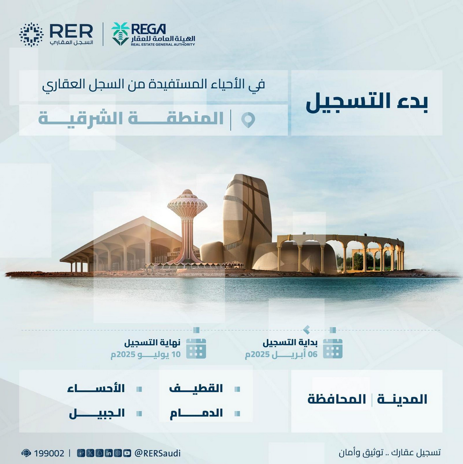 أعلن السجل العقاري اليوم، بدء استقبال طلبات التسجيل العيني الأول لـ (207.885) قطعة عقارية في (230) حيًا بالمنطقة الشرقية، و(252) قطعة عقارية في محافظة مِرات بمنطقة الرياض.