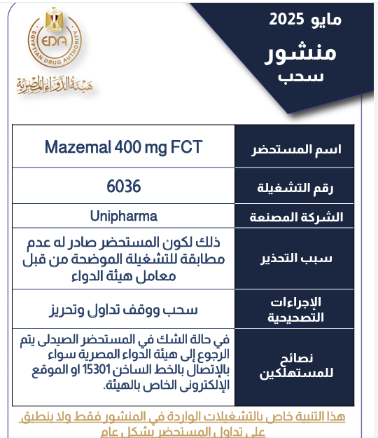 في منشور رقم «16» لعام 2025، وجهت الهيئة بسحب وتشغيلة مغشوشة أخرى من دواء Mazemal 400 mg FCT، المخصص لعلاج نوبات الصرع وآلام الأعصاب، وذكرت الهيئة أن رقم التشغيلة المسحوبة هو 6036.