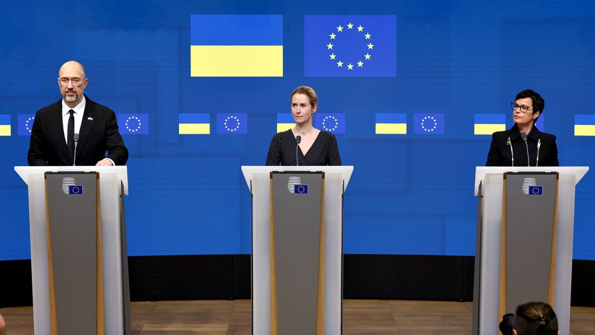 يقف مارتا كوس ، الذي يقف إلى جانبه ، المفوضية الأوروبية للتوسع ، الذي يشرف على ترشيح الاتحاد الأوروبي في أوكرانيا ، مطمئنة من قبل خطوط Shmyhal الحمراء.
