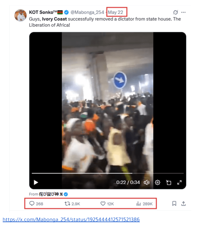اللافت أن الحملة اعتمدت على إعادة تدوير محتوى بصري سبق نشره في سياقات مغايرة، مثل صور احتجاجات كينيا لعام 2024، وفيديوهات من طرابلس، بل ولقطات احتفال بفوز منتخب الكوت ديفوار بكأس الأمم الأفريقية 2023.
