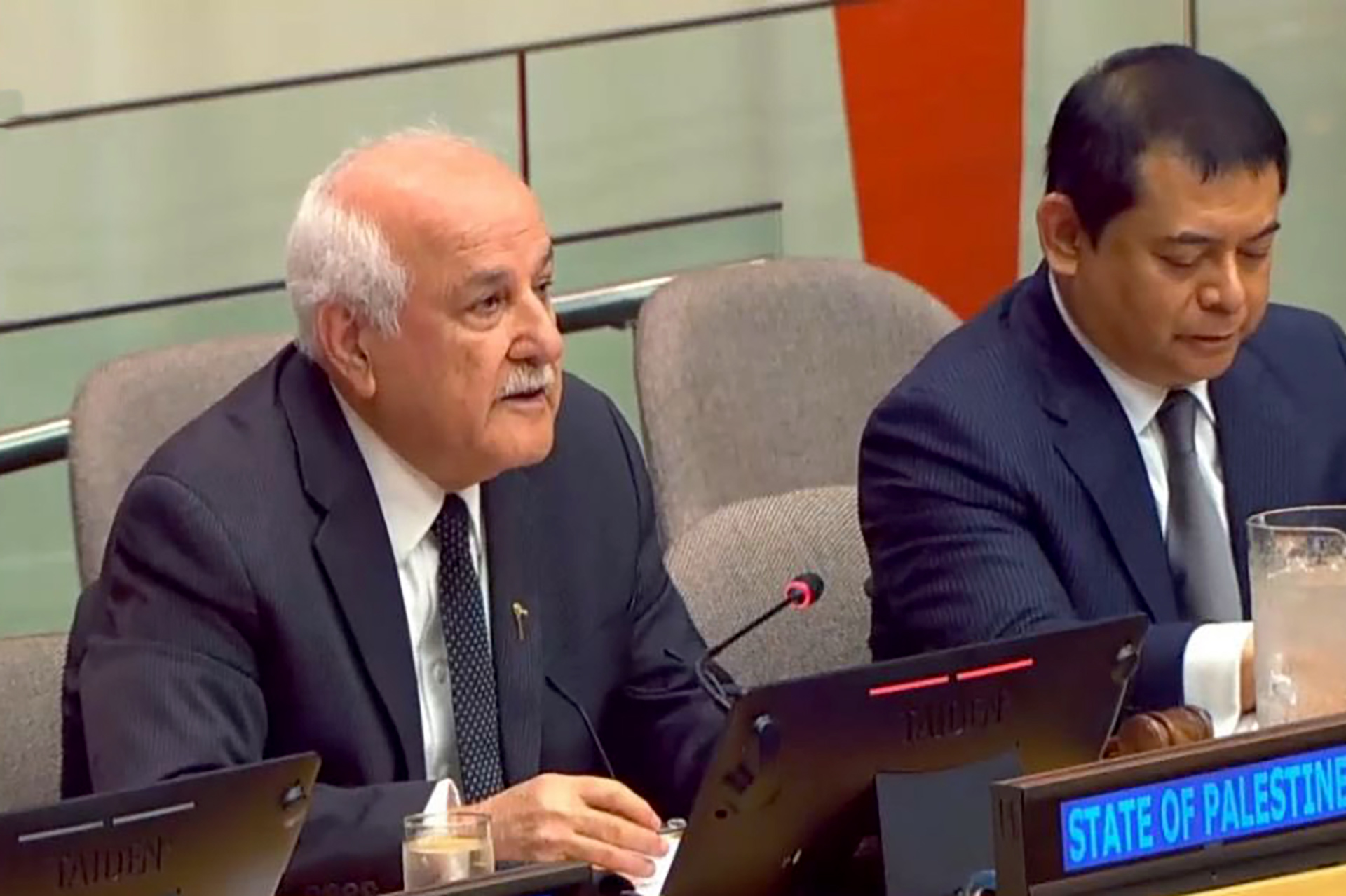 وألقى المندوب الدائم لدولة فلسطين لدى الأمم المتحدة رياض منصور كلمة، نيابة عن الرئيس عباس، ثمّن فيها قرار الأمم المتحدة التاريخي بإحياء ذكرى نكبة فلسطين عام 1948.