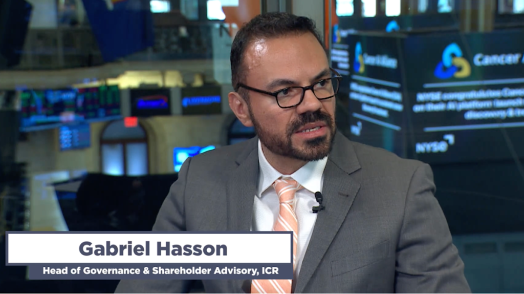 CorpGov استضافت محادثة ودية في الأول من أكتوبر من قاعة بورصة نيويورك خلال قمة الاكتتاب العام للأسهم الخاصة في بورصة نيويورك مع غابرييل حسون، الرئيس العالمي للحوكمة واستشارات المساهمين في ICR. المقابلة الشخصية كانت انضم بواسطة رئيس التحرير جون جانارون وناقشوا أتقديم المشورة للشركات على الطريق إلى الاكتتاب العام مع وجود إطار عمل للحوكمة الجيدة، وتمكين المدير المالي الحديث، وتكييف التكنولوجيا الجديدة لتكون أكثر كفاءة، وأكثر من ذلك.