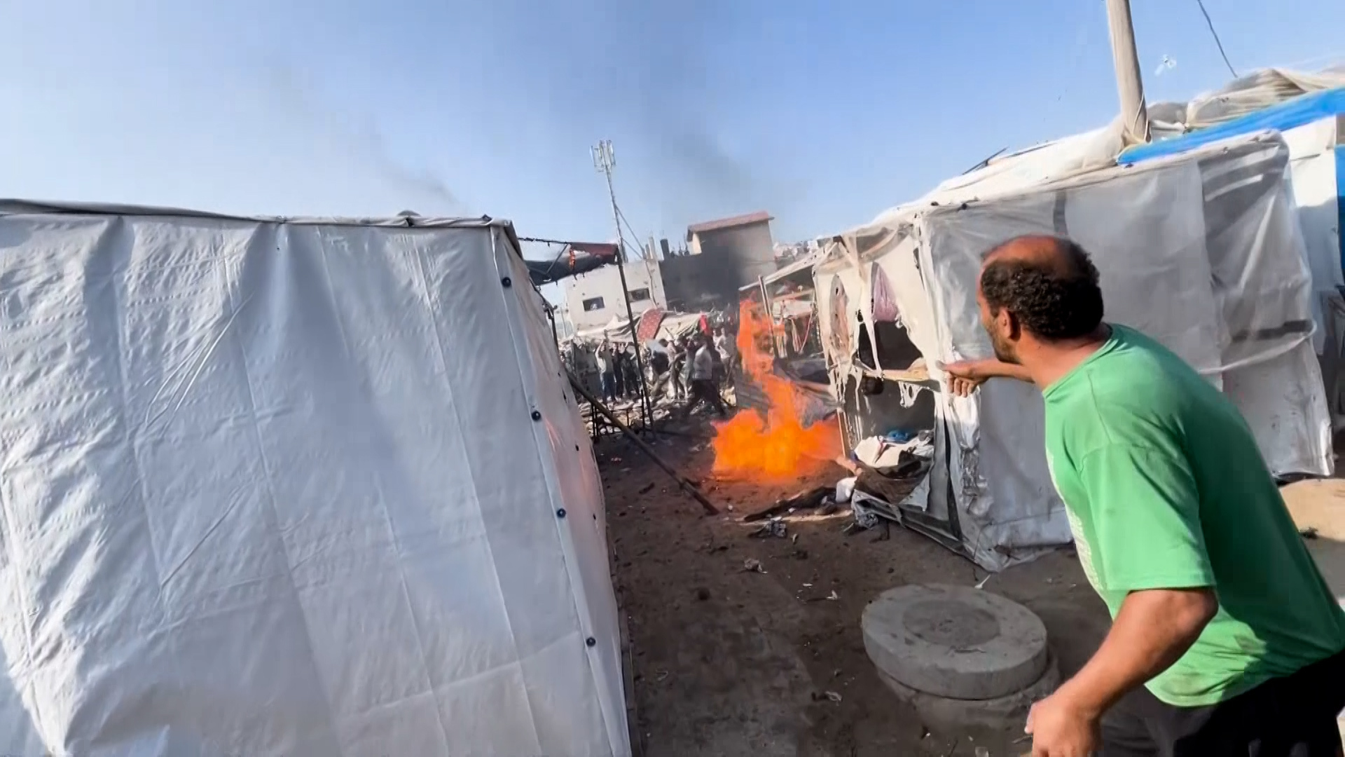 نقلت الجزيرة صورا تظهر أحد مخيمات النازحين في منطقة دير البلح وسط غزة وقد اندلعت فيه حرائق وسقط شهداء بسبب قصف إسرائيلي. المصدر : الجزيرة