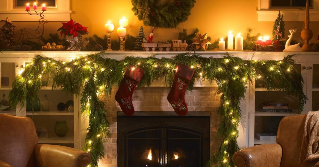 لا شيء يجلس أجمل فوق المدفأة من إكليل كثيف وحيوي. يتضمن هذا الأضواء والتوت وأقماع الصنوبر!