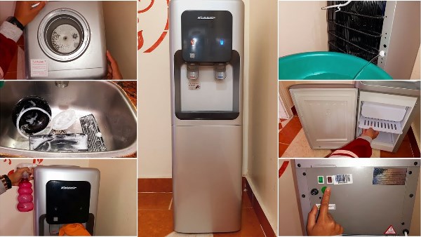 في البداية افصل المبرد من الكهرباء، ثم افتح الصنابير لتصريف المياه المتبقية في الخزان الداخلي، ثم أزل الزجاجة أو الخزان العلوي إن وُجد.