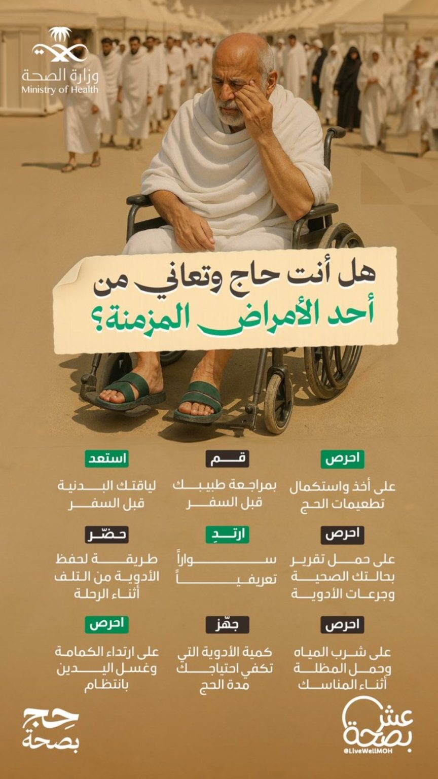 حذرت المنصة التوعوية لوزارة الصحة “عش بصحة” أصحاب الأمراض المزمنة خلال فترة الحج ووجهت لهم عدد من النصائح للحفاظ على صحتهم أثناء أداء المناسك.