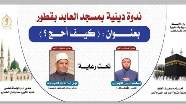 ينظم مسجد العابد بمدينة قطور بمحافظة الغربية، يوم الأربعاء المقبل، عقب صلاة العصر، ندوة بعنوان: “كيف أحج”، برعاية الدكتور أسامة الأزهري، وزير الأوقاف، وبحضور الدكتور نوح عبد الحليم العيسوي، وكيل وزارة الأوقاف بالغربية، والشيخ محمد عبد الغني صولة، مدير الدعوة بأوقاف الغربية، والشيخ عصام العشماوي، مدير إدارة أوقاف قطور، وجمع غفير من حجاج بيت الله الذين سيؤدون فريضة الحج هذا العام.