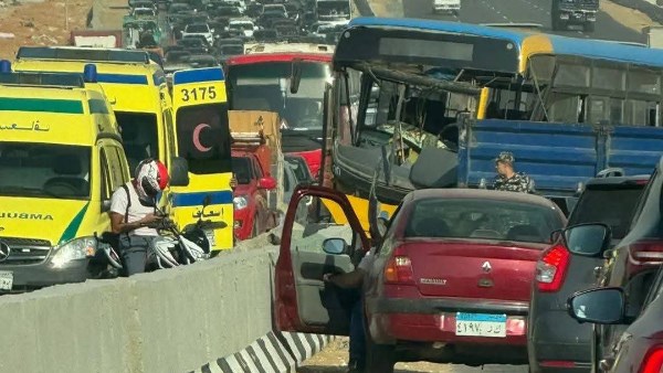 ويتولى رجال المرور تسيير حركة الطريق حيث ترفع الأوناش المرورية آثار الحادث لتخفيف الكثافات وإعادة الحركة للطريق.