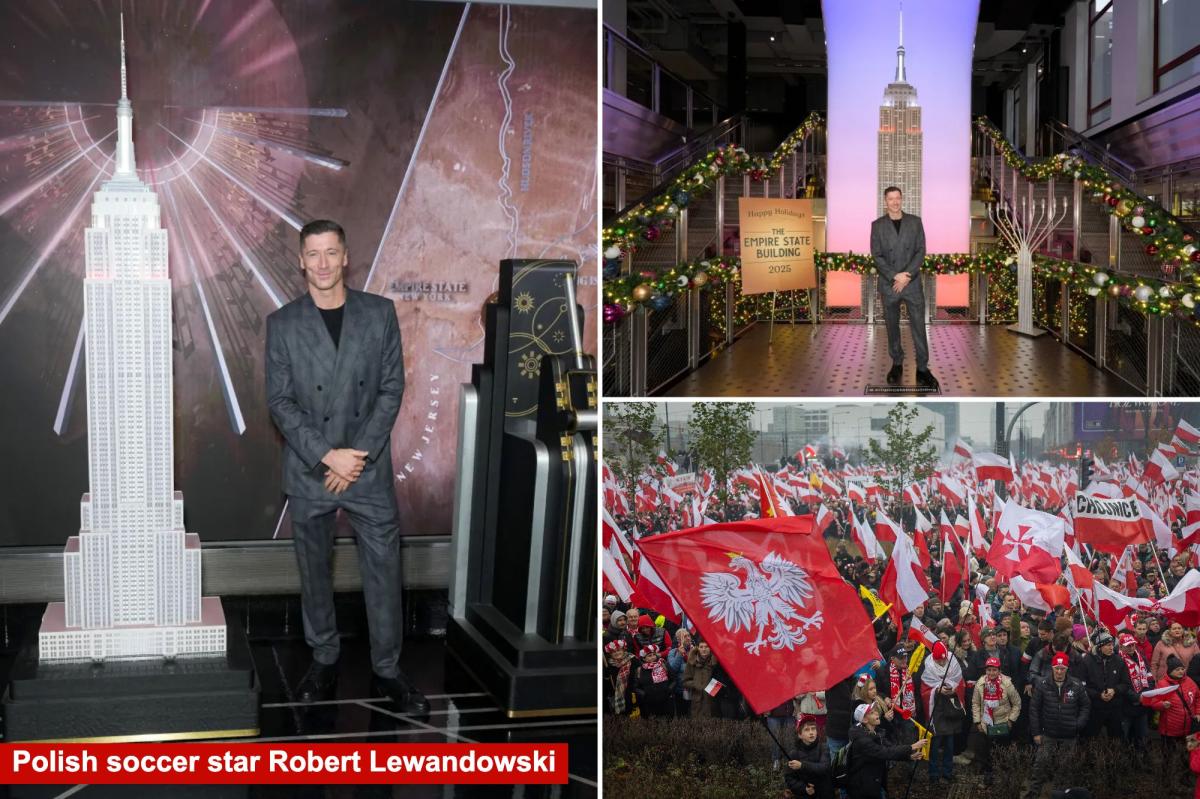 قام نجم كرة القدم البولندي روبرت ليفاندوفسكي بتشغيل أضواء LED باللونين الأحمر والأبيض في ناطحة السحاب في مانهاتن في الساعة 10 مساءً بالتوقيت البولندي، قبل العيد الوطني للبلاد يوم الثلاثاء.