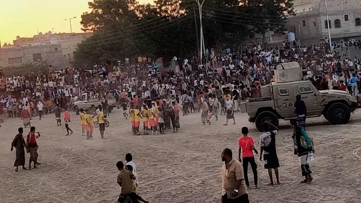 أثار مشهد اقتحام مدرعة عسكرية لملعب كرة قدم بمدينة زنجبار جنوب اليمن جدلا واسعا على منصات التواصل، بعد تحول مباراة محلية بين فريقين للتنافس في بطولة محلية إلى فوضى عارمة استدعت تدخلا أمنيا غير مألوف.