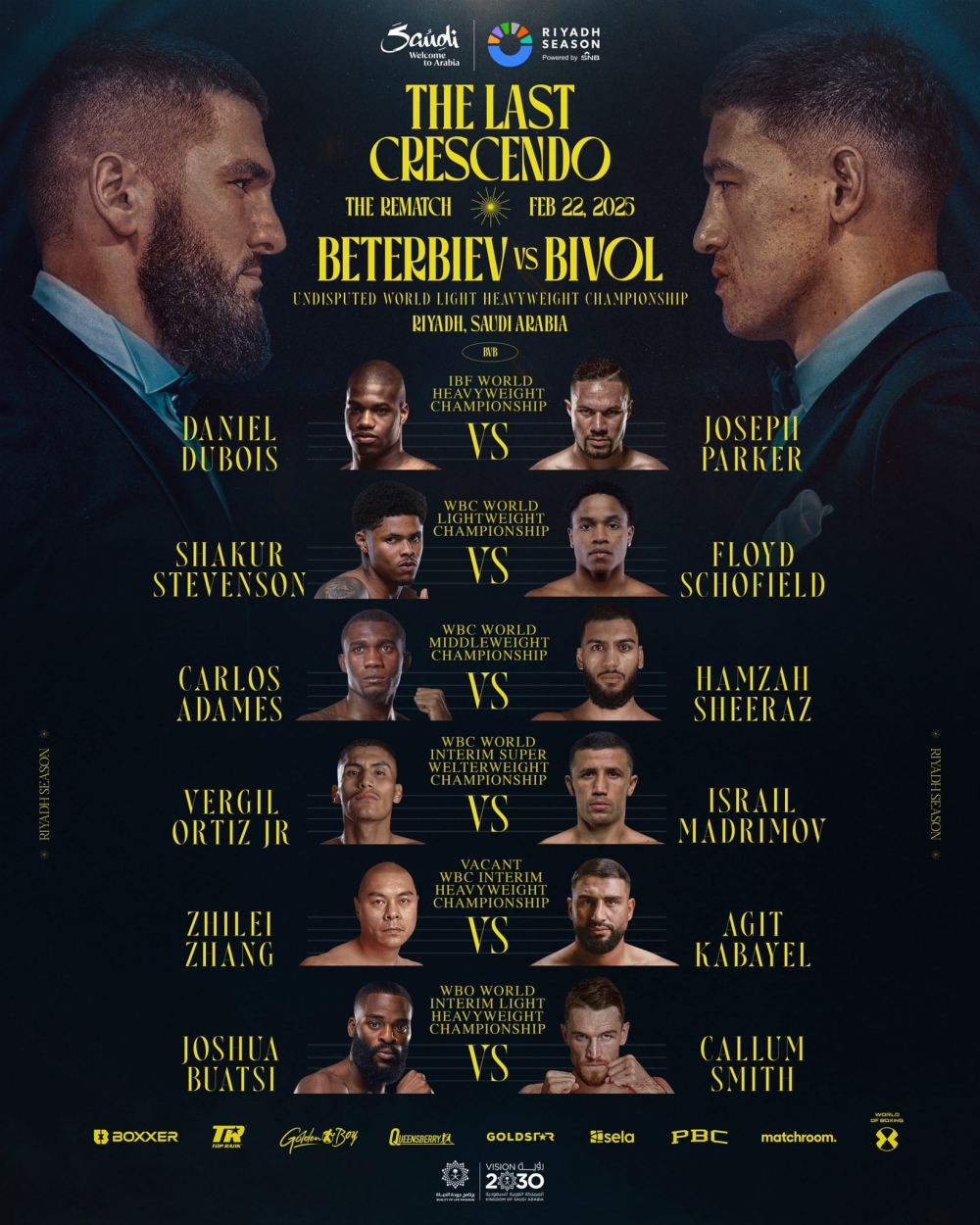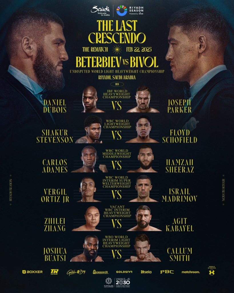 حيث تتصدر الأمسية مواجهة ملحمية على لقب بطولة العالم الموحدة للوزن الثقيل الخفيف مرة أخرى، عندما يتواجه الكندي أرتور بيتيربييف، حامل اللقب مع سجل مثالي يضم 21 انتصارًا دون هزيمة، منها 20 بالضربة القاضية، مع الروسي ديميتري بيفول، الذي يملك سجلًا مميزًا بـ23 انتصارًا، منها 12 بالضربة القاضية، مقابل خسارة واحدة فقط كانت قد حدثت أمام منافسه الذي يسعى لإعادة مواجهته ليثأر منه. هذه المواجهة المرتقبة تمثل ذروة المنافسة بين اثنين من أعظم الملاكمين في العصر الحالي، وستحدد من سيحكم عرش هذا الوزن.