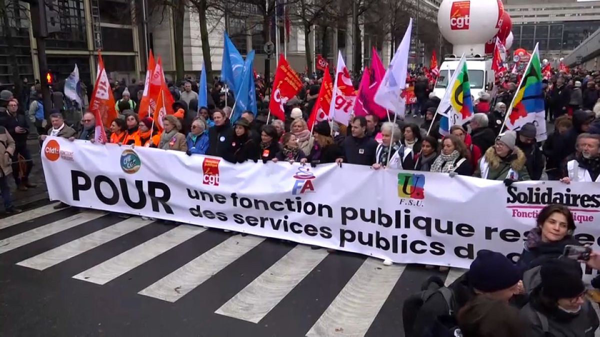 تجمع عشرات الآلاف من المتظاهرين في أنحاء فرنسا، الخميس، في إطار إضراب احتجاجا على ظروف العمل الصعبة وتخفيضات ميزانية الخدمة العامة.