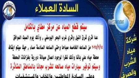 أعلنت شركة مياه الشرب والصرف الصحي بالمنيا، قطع مياه الشرب عن مركز مطاي بالكامل، اليوم السبت 15 فبراير الجاري حتى…