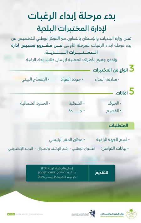أعلنت وزارة البلديات والإسكان بالتعاون مع المركز الوطني للتخصيص، بدء مرحلة إبداء الرغبات لمشروع تخصيص إدارة المختبرات البلدية في خمس…