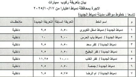 اعتمد الدكتور أيمن الشهابى محافظ دمياط، تعديل تعريفة الركوب لسيارات الأجرة بنطاق المحافظة، وفقًا لما هو موضح بالجداول المرفقة ،…
